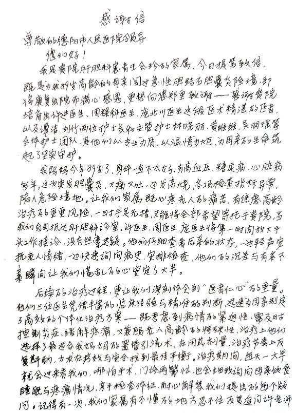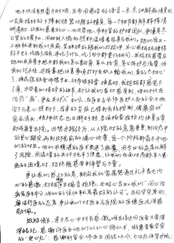 在全體醫(yī)護人員精心治療和溫暖照護下,王婆婆感染逐步控制,黃疸消退,胸腔積液明顯減少,心功能及一般情況穩(wěn)步改善。近日,王婆婆已順利拔除胸引管,病情好轉(zhuǎn)出院。家屬特意手寫感謝信,對醫(yī)護團隊精湛的醫(yī)術(shù)、無私的奉獻精神和極致的服務(wù)表達深深的謝意。