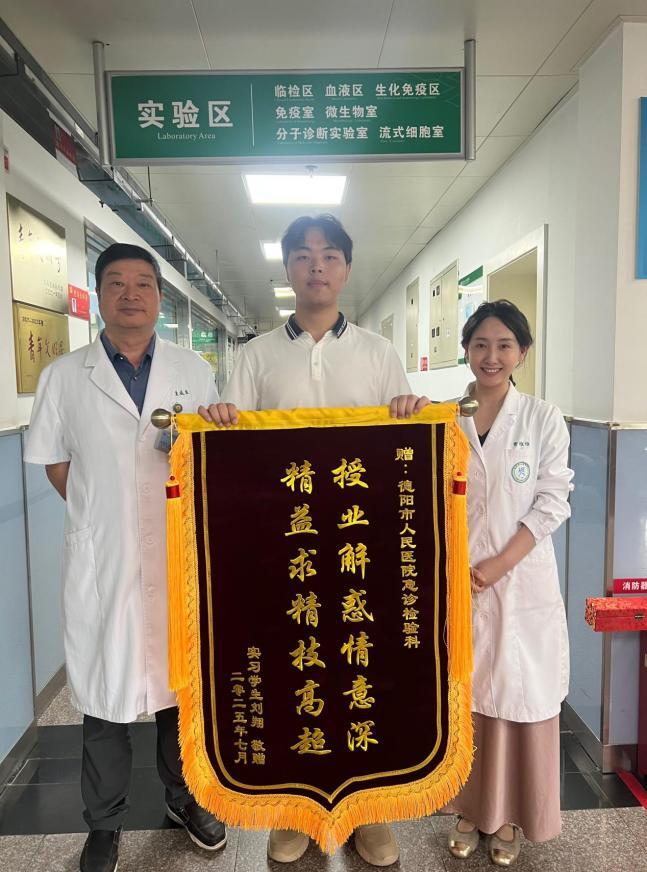 一個(gè)月的實(shí)習(xí)雖短,收獲卻無(wú)比豐厚。這份寶貴經(jīng)歷,這份來(lái)自師長(zhǎng)們的傾囊相授,讓我充滿感激。臨別之際,我代表全體實(shí)習(xí)生,懷著最誠(chéng)摯的感謝,為急診檢驗(yàn)科全體老師獻(xiàn)上錦旗——“授業(yè)解惑情意深,精益求精技高超”。這面錦旗承載著我們對(duì)科室培養(yǎng)之恩的深深謝意,也激勵(lì)著我在未來(lái)的醫(yī)學(xué)道路上繼續(xù)前行。(實(shí)習(xí)生 劉翔)