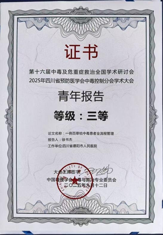近日,第十六屆中毒及危重癥救治全國研討會暨2025年四川省預防醫(yī)學會中毒控制學術年會在成都落幕。作為國內(nèi)中毒領域的權威學術平臺,本次大會匯聚了來自中國醫(yī)大一院、南京鼓樓醫(yī)院、華西醫(yī)院、浙大附一院、天津醫(yī)大總醫(yī)院、軍事科學院等國內(nèi)頂尖醫(yī)療機構(gòu)的精英團隊。在備受關注的“中毒病例全國青年報告會”中,我院急診科徐書杰醫(yī)師匯報的《一例百草枯中毒患者全流程管理》案例,從全國60余份參賽病例中脫穎而出,榮獲三等獎。
