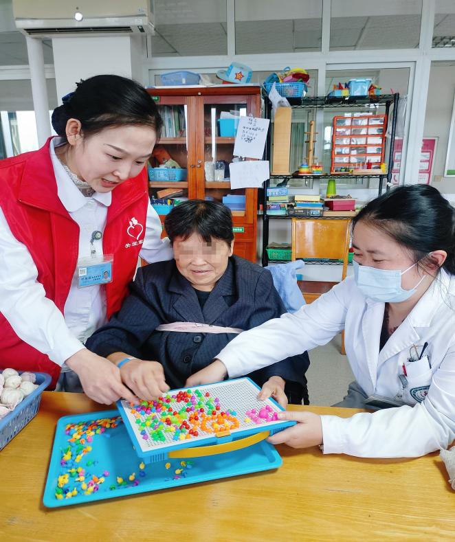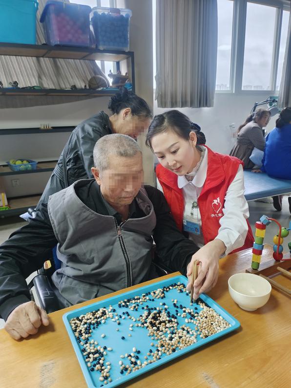 活動現(xiàn)場,康復治療師與護士帶領老年患者進行了趣味手指操集體練習,利用康復訓練器材如套圈、抓球、夾豆子,拼圖、插木釘?shù)龋M行了手部精細動作訓練。在歡聲笑語中有效鍛煉了手眼協(xié)調(diào)性與關節(jié)靈活性,將枯燥的訓練變成了快樂的挑戰(zhàn)。