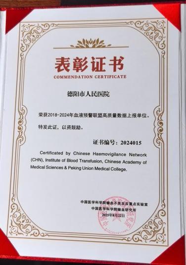 會(huì)上,德陽(yáng)市人民醫(yī)院輸血科榮獲“2018—2024年血液預(yù)警聯(lián)盟高質(zhì)量數(shù)據(jù)上報(bào)單位”(全國(guó)15家)稱(chēng)號(hào)。