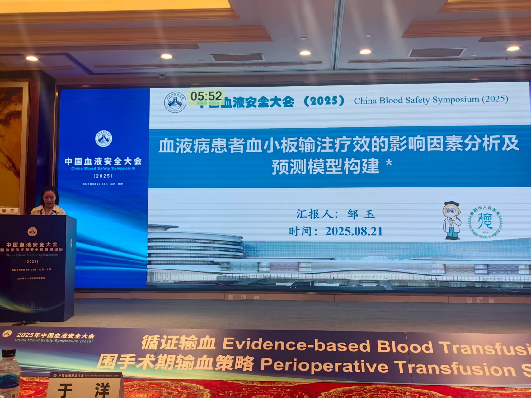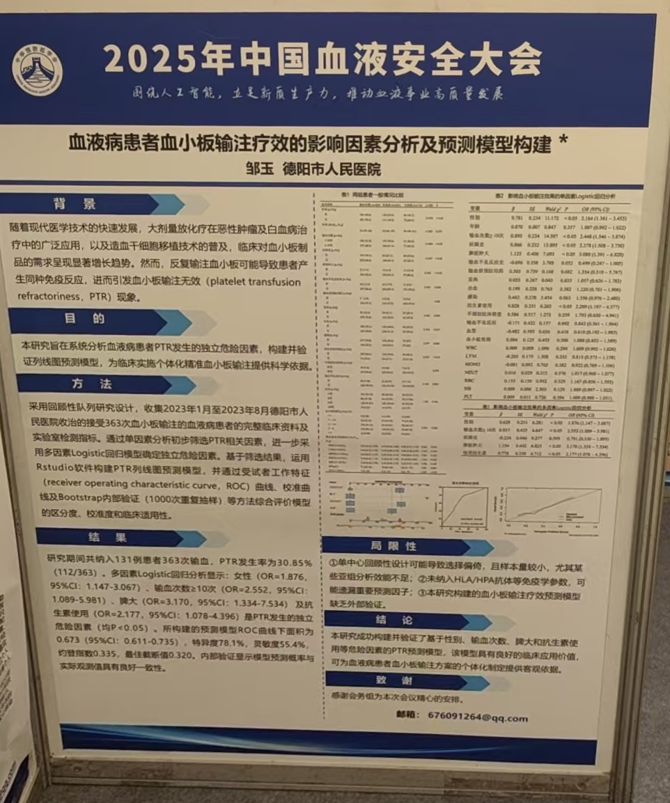 會(huì)上,德陽(yáng)市人民醫(yī)院輸血科范玥投稿的“富血小板血漿采集及血小板濃度影響因素的研究”作壁報(bào)展示;鄒玉投稿的“血液病患者血小板輸注療效的影響因素分析及預(yù)測(cè)模型構(gòu)建”作壁報(bào)展示,鄒玉在大會(huì)循證輸血專(zhuān)題作“血液病患者血小板輸注療效的影響因素分析及預(yù)測(cè)模型構(gòu)建”口頭報(bào)告。