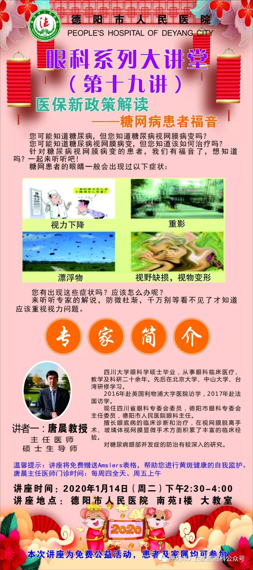 轉(zhuǎn)眼間,2020年已經(jīng)揭開了序幕,小編先給大家擺個(gè)早年,在新的一年到來之際,祝您新春快樂,鼠年大吉;同時(shí)祝您雙眼炯炯有神。什么?你有糖尿???有糖尿病視網(wǎng)膜病變?不要怕,2020年01月14日德陽市人民醫(yī)院南苑一樓大教室,眼科唐晨主任親講醫(yī)保新政策解讀-----糖尿病患者的福音,快快轉(zhuǎn)發(fā)給親朋好友吧。