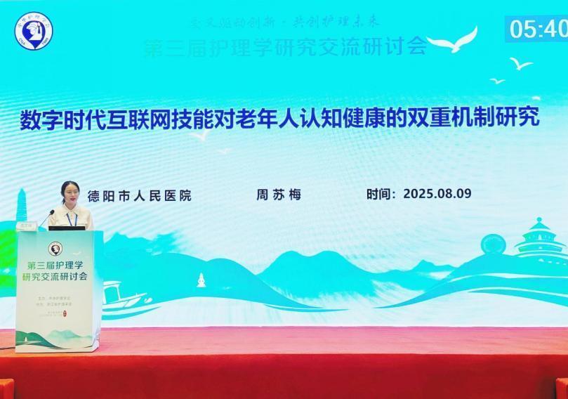 神經(jīng)外科周蘇梅以《數(shù)字時(shí)代互聯(lián)網(wǎng)技能對(duì)老年人認(rèn)知健康的雙重機(jī)制研究》為題,在成人與老年護(hù)理學(xué)研究專場作大會(huì)發(fā)言,分析了互聯(lián)網(wǎng)技能對(duì)老年人認(rèn)知健康的作用路徑及社會(huì)支持、技術(shù)恐懼、社會(huì)孤立的影響。